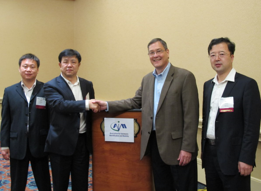 图一、AIM China常务副理事长张琳、副秘书长唐成、GS1China技术研究部主任助理韩树文等与AIM Global主席 Chuck Evanhoe