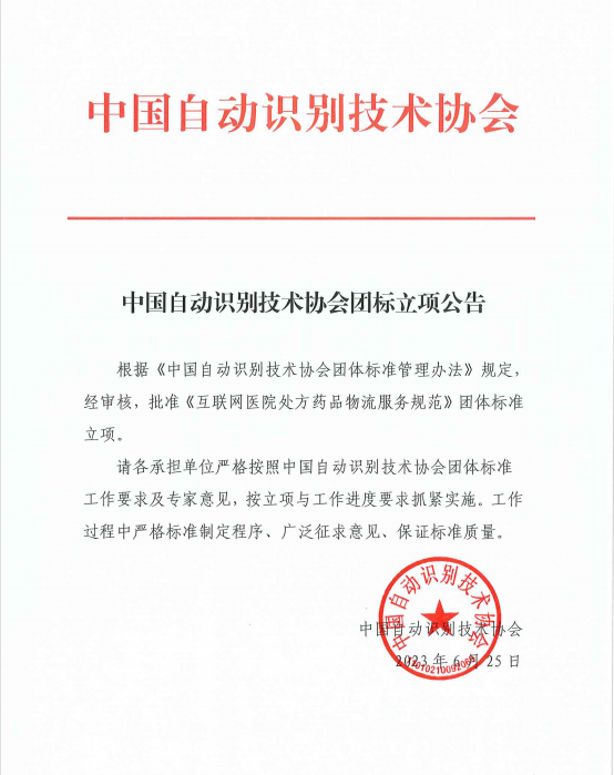 2023年6月25日上午,中国自动识别技术协会以视频会议的形式召开了《互联网医院处方药品物流服务规范》团体标准立项会。