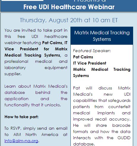 美国东部时间8月20日上午10点,AIM北美将会举办免费的 UDI Healthcare Webinar在线研讨会,主讲人是来自Matrix Medical Tracking Systems的IT副主管Pat Cairns。如需参加请发送邮件到info@aim-na.org.