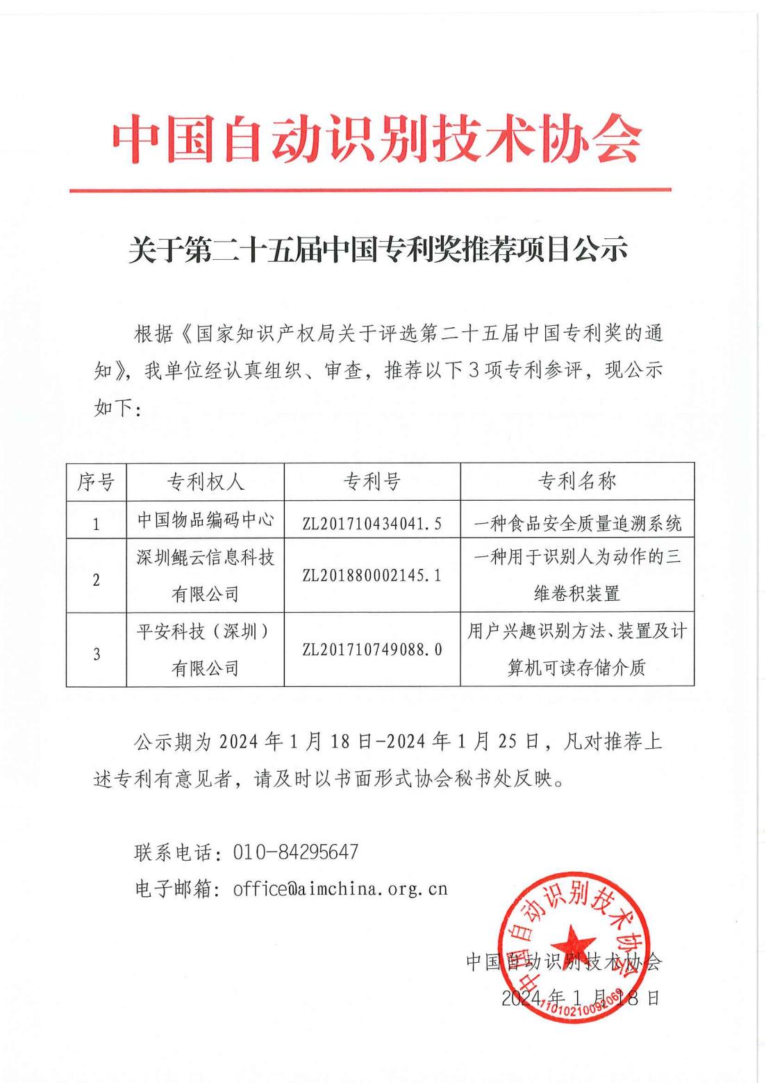关于第二十五届中国专利奖推荐项目公示