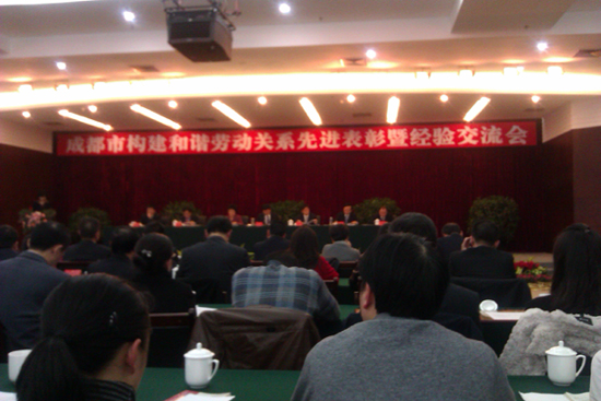 (本网讯)12月20日下午,成都市构建和谐劳动关系先进表彰暨经验交流会在成都高新区孵化园3号楼会议室隆重召开。市委副书记、市政协主席唐川平出席会议并作重要讲话。市委常委、副市长孙平,市委常委、统战部长、市总工会主席包惠,市政府副市长谢瑞武,市长助理刘俊林,市委副秘书长许兴国,市政府副秘书长周万生出席会议。会议由包惠同志主持。 会上,成都新得利电子有限公司等99家企业被市总工会、市纪委、市委组织部、市委宣传部、市经信委、市监察局、市人社局、市商务局、市工商局、市国资委、市投促局、市工商联、成都企联/企业家协会授予“成都市模范劳动关系和谐企业”称号。授予成都高新技术产业开发区孵化园等9个工业园区(商务园区)“成都市模范劳动关系和谐工业园区(商务园区)”称号;授予锦江区东光街道等25个街道(乡镇)、社区“成都市模范劳动关系和谐街道(乡镇)社区”称号。